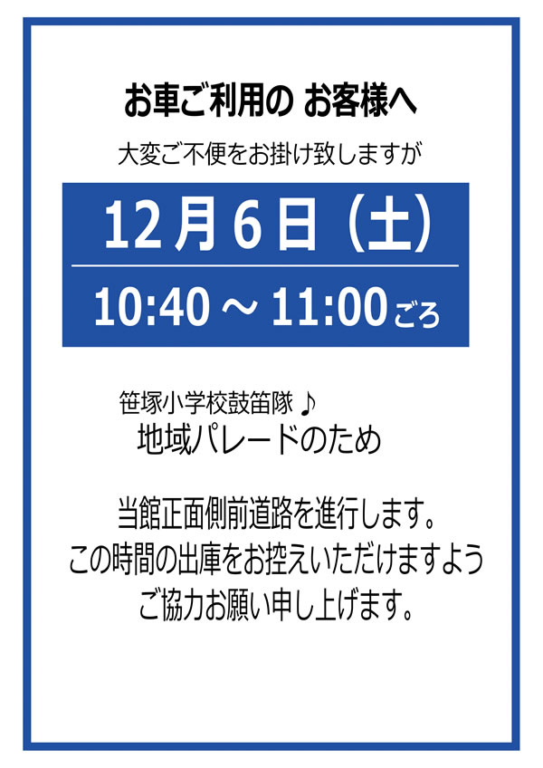 お車ご利用のお客様へ 12/6(土) ツイート 大変ご不便をお掛け致しますが「笹塚小学校鼓笛隊 地域パレード」のため当館正面側前道路を進行します。 地域パレード時間帯 12月6日(土)10:40~11:00ごろ この時間の出庫をお控えいただけますようご協力お願い申し上げます。 臨時休業日のお知らせ 一覧にもどる ウインターセール抽選会